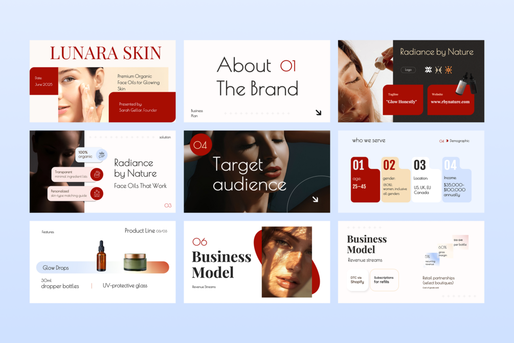 LUNARA SKIN A modern, professional and clean investor-ready eCommerce Business Plan designed for brands selling clean beauty products. Perfect for entrepreneurs, marketers, and startups launching or pitching a skincare line.